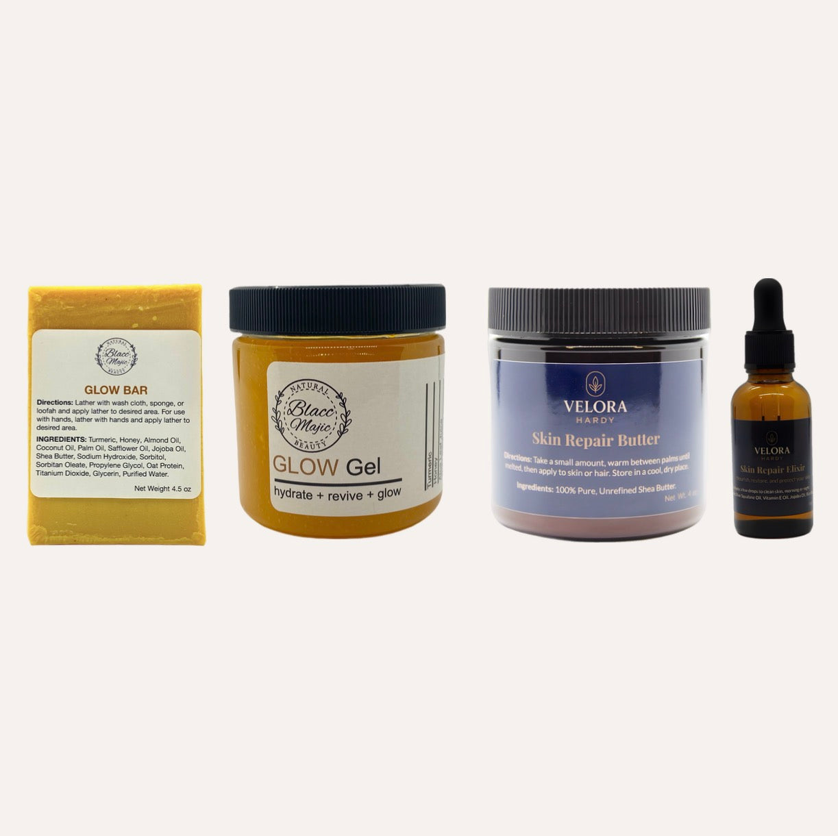 This is our GLOW Kit DELUXE. It consists of our GLOW Bar, GLOW Gel, and Salvation, our Repairing Face Oil. This GLOW Kit SUPREME is easy, simple, and it works!